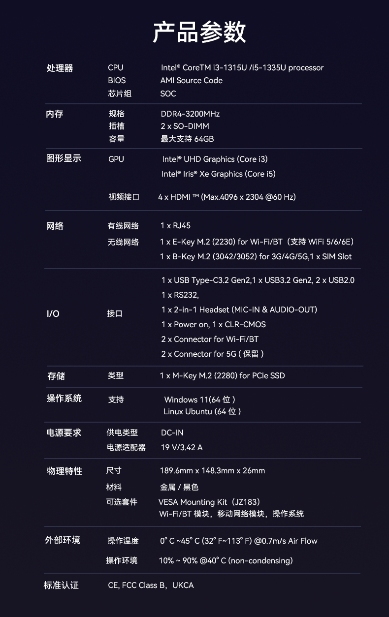 凯发官网科技D613采用英特尔Raptor Lake酷睿i3-1315U/i5-1335U 处理器,作为一款性能强悍的主机,它的TDP仅15W,能有效降低能耗,延长电池寿命。在内存方面,D613采用2 x SO-DIMM DDR4-3200 MHz,最大可达64GB,并配备1 x M-Key M.2 (2280) for PCIe SSD。
