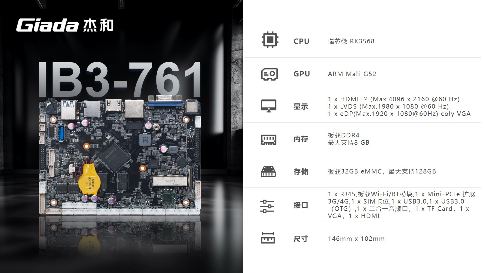 凯发官网工业级ARM主板IB3-761基于瑞芯微RK3568四核64位处理器开发。内置1TOPS算力的NPU,满足轻量级端侧AI计算应用。
