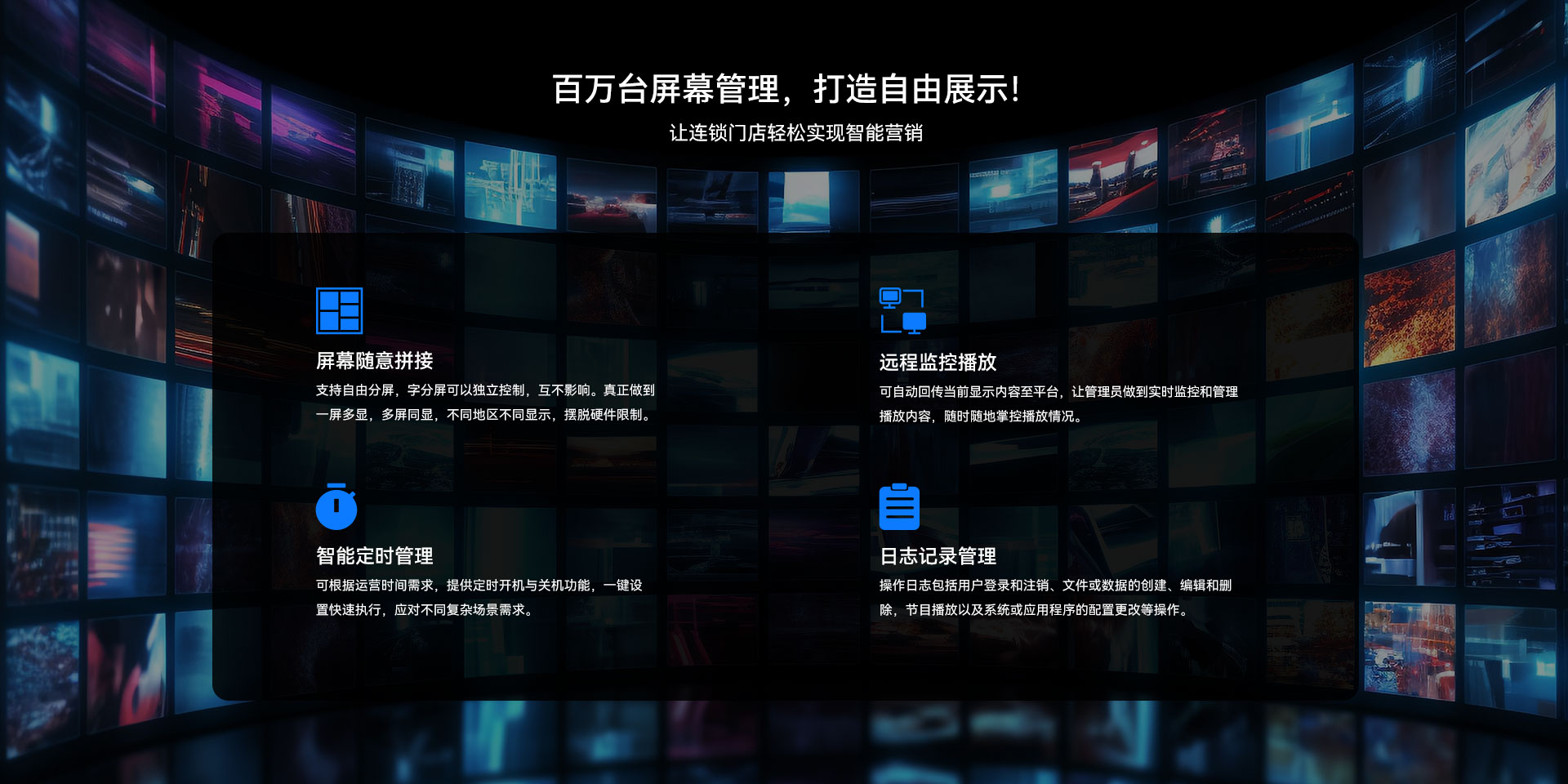 目前凯发官网科技GDSM-ES系统覆盖市场上多形态网络智能显示终端,满足行业全产品业态需求,如广告机、LED显示屏、LCD拼接屏 、普通液晶电视等各种显示终端,广泛用于广告宣传、通知公告、指示引导。