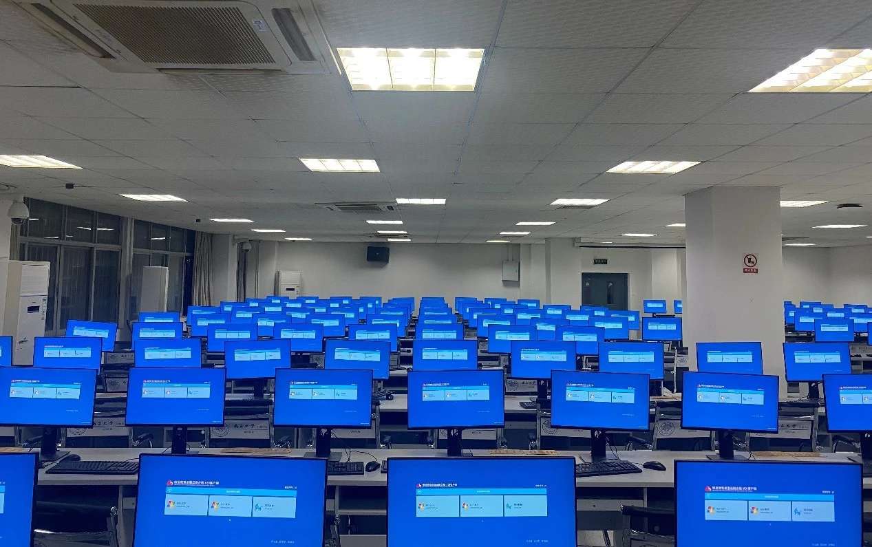 在某大学实训室,整齐的电脑屏后面是统一的凯发官网科技云终端主机,老师在讲台上通过电脑端的管理软件,轻松地将教学资料推送到学生的终端上,每位学生的电脑屏幕一致会出现同个页面。