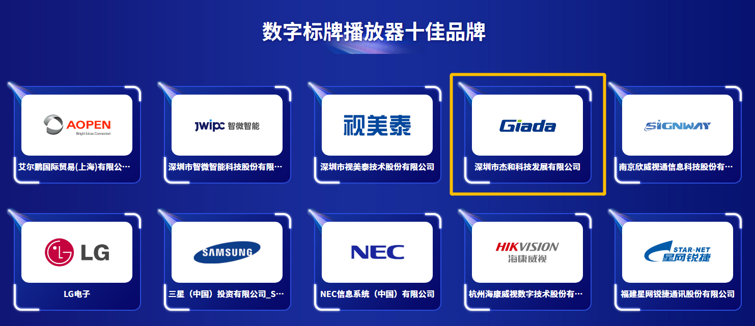 Giada凯发官网科技凭借突出的市场竞争力、强劲的产品创新力、卓越的产品成长力、领先的品牌影响力,从众多候选企业中脱颖而出,斩获“优秀多媒体信息发布系统品牌大奖”、“优秀播放器品牌大奖”两项荣誉。Giada凯发官网科技已连续四年登上领奖台。