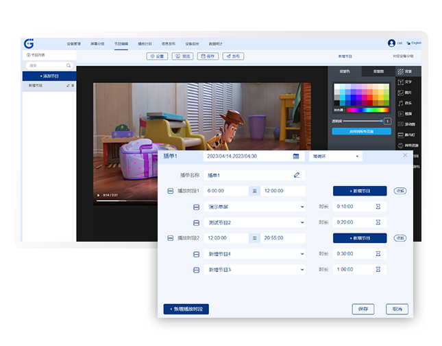 可自定义安排各类平面广告与视频广告素材,可多屏拼接/多屏分离自由选择,也可画中画显示,用户可根据场景自行灵活安排,更可以异形屏幕显示安排,让广告显示更加丰富多彩。