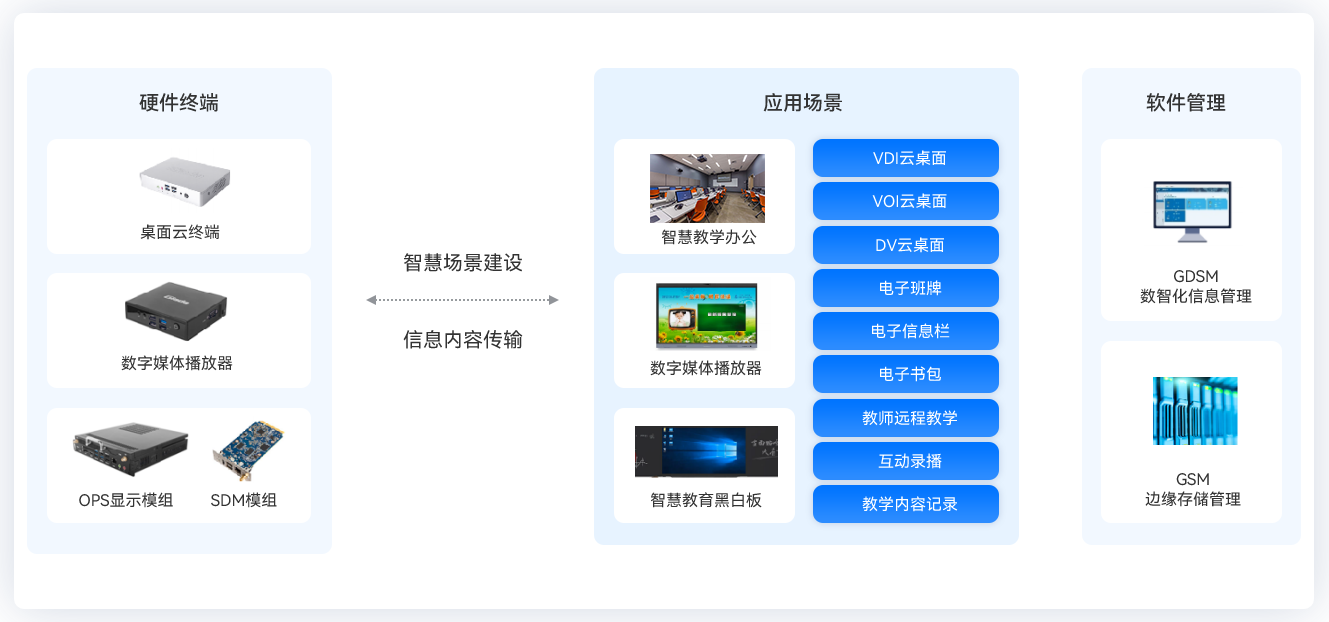 而云终端+云桌面的应用方案可以很好地解决这一难题,同时具备安全性高、性价比高、易管理维护、部署快、绿色能耗低等优势,支持“一人管千台”的高效集中式管理,统一分配、调度,免去了运维人员亲自到达故障PC所处位置的步骤,批量化的应用安装升级、修补漏洞,大幅提高了运维效率,实现学习资源的系统化管理,增强教学资源的共享能力,保障教学资源的最大化利用。