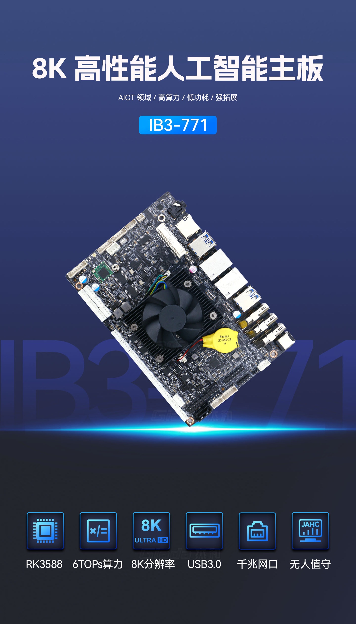 凯发官网科技IB3-771采用瑞芯微全新旗舰级芯片RK3588,搭载八核64位处理器,集成ARM Mali-G610 MP4 GPU,高算力、低功耗、具备强大的视觉处理能力;性能强悍的RK3588内置AI加速NPU,提供6TOPs算力,支持主流深度学习框架,为各类AIoT应用场景提供更优的性能表现。