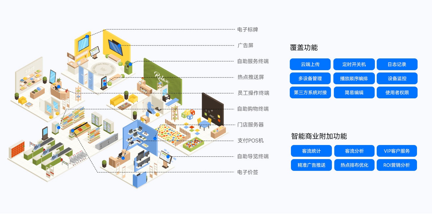 凯发官网智慧零售解决方案依托凯发官网GDSM-ES智能零售管理系统,为全球零售门店客户提供了功能齐全的数字化运营管理工具,提供显示信息编辑、信息发布、AI识别、客户分析和会员管理等功能,实现了对设备、内容、营销、运营的综合数智化管理能力,为精准运营管理赋能。