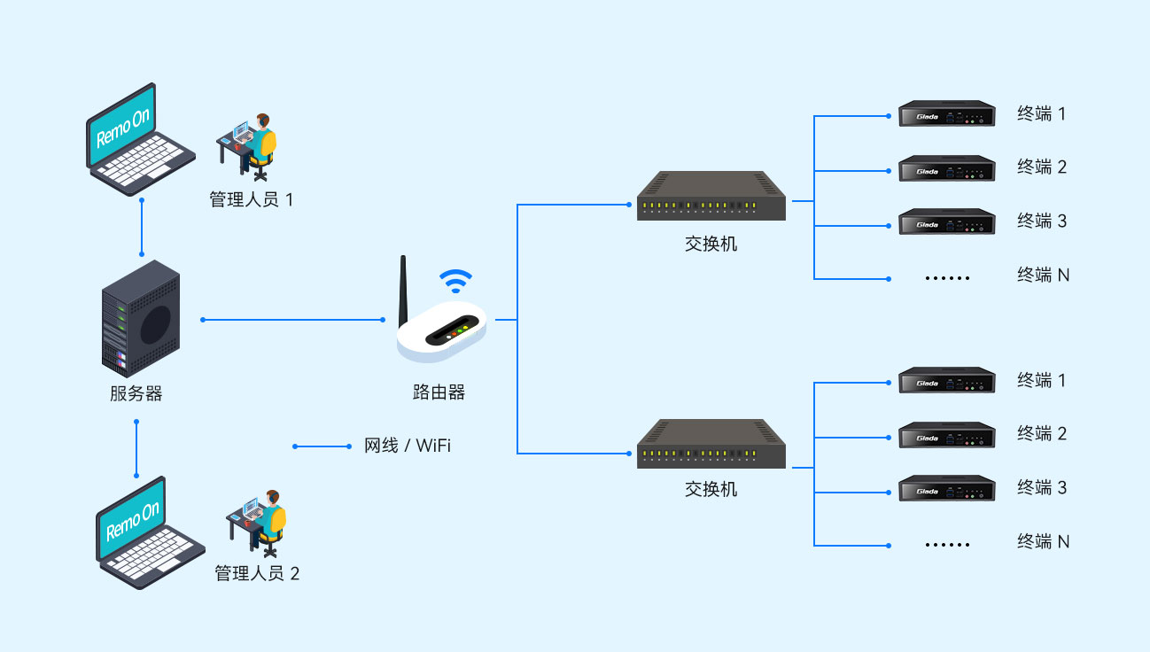 方案涵盖云终端、边缘存储服务器、数字标牌、OPS等智能硬件产品,以及Remo On智能远程监管系统、GSM边缘存储管理系统等软件,提供智能办公硬软件一体化服务,提升员工的办公体验,实现可视化、数据化、信息化、智能化管理。