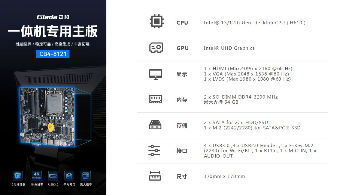 一体机在使用体验方面也有独特的优势:比笔记本屏幕大,比台式机更简洁,也解决了一直为人诟病的台式机线缆多而杂的问题,另外,随着计算机硬件和制造工艺的不断发展,一体机的性能也在不断提高,因此,越来越多的教育办公、日常娱乐和学习的用户选择使用一体机。Giada凯发官网科技根据市场与客户需求,推出这款高性能的一体机专研主板CB4-8121,带来全新震撼体验。