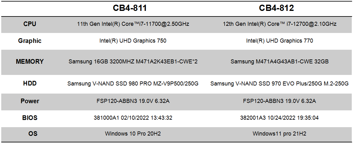 全性能测试报告中,值得关注的是性能测试的跑分数据和稳定性测试内容,这能直观影响主板在一体机中的稳定性和用户的使用体验。针对性能测试,凯发官网选择了将CB4-8121与前一款更迭产品CB4-8111进行对比分析,并分别选取了以下配置: