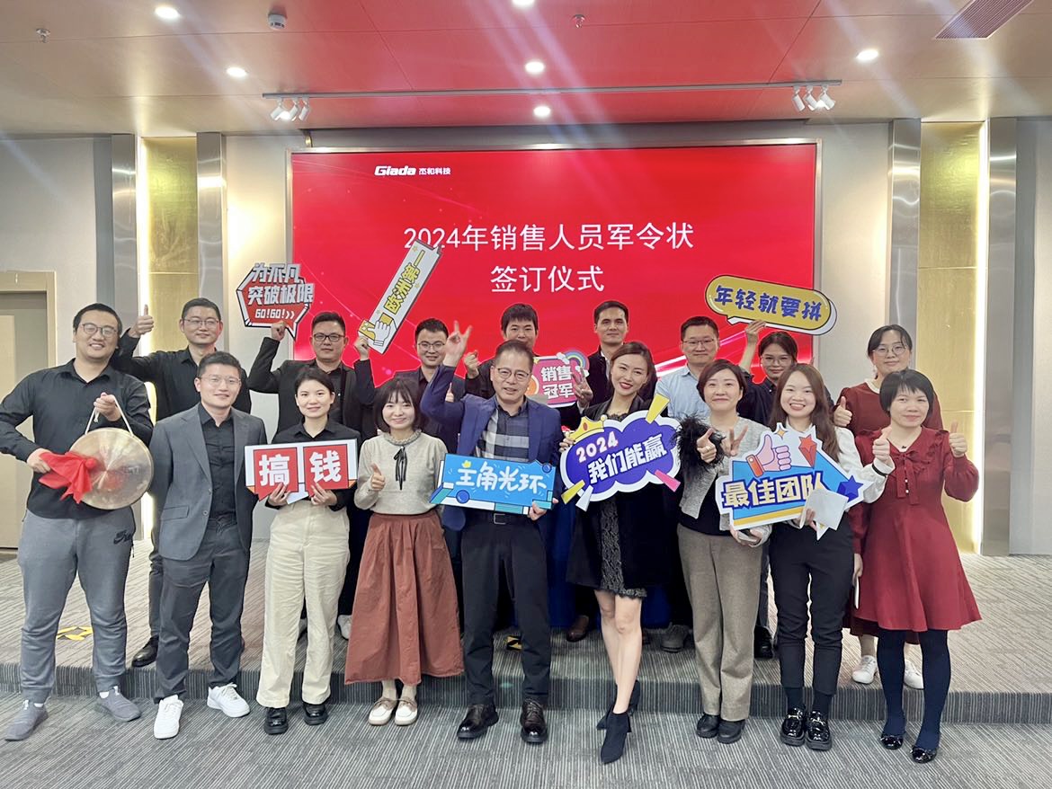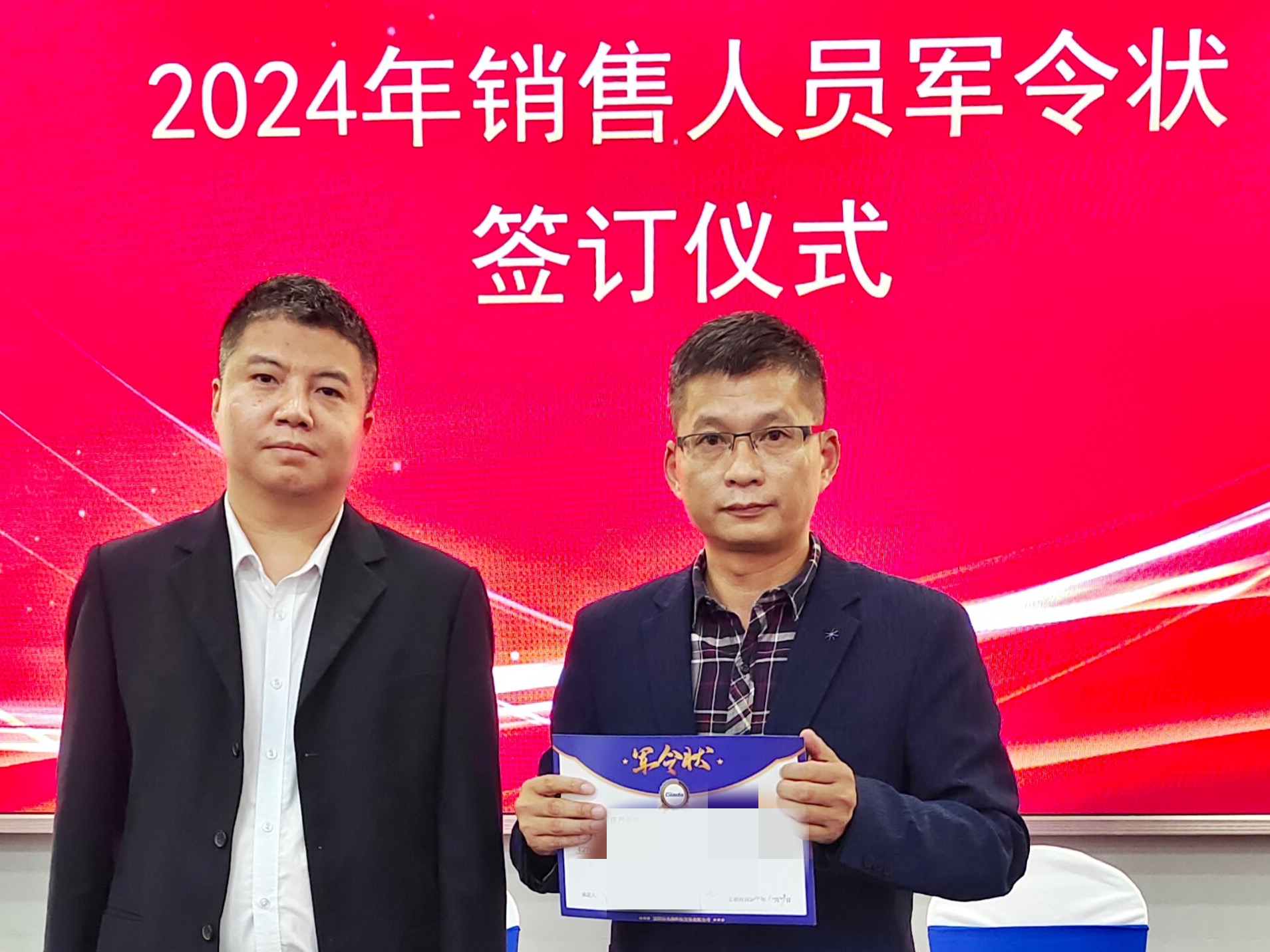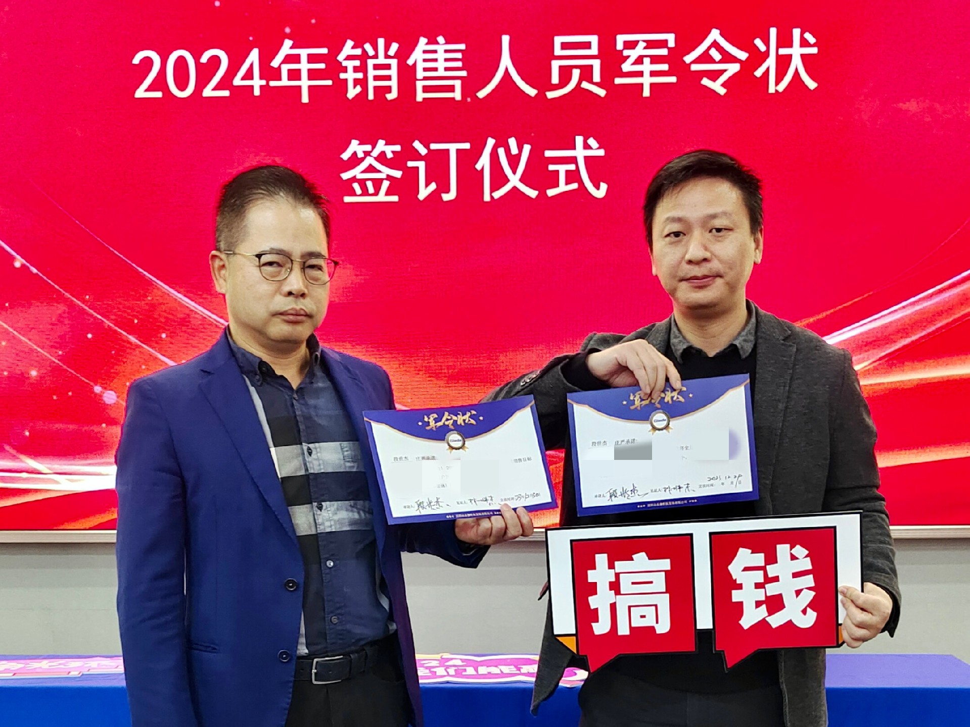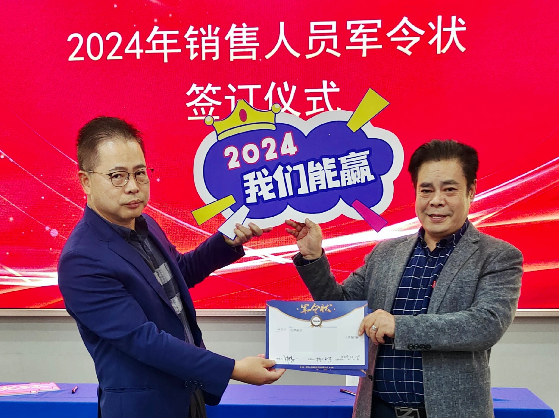 2024公司年度战略目标确立,言出必行,使命必达,国际/国内销售团队为了共同的目标开始军令状签约仪式。一纸军令状,是凯发官网科技与销售人员的双向承诺,是压力,更是动力。是不破楼兰终不还的决心,更是春风得意马蹄疾,一日看尽长安花的期待。