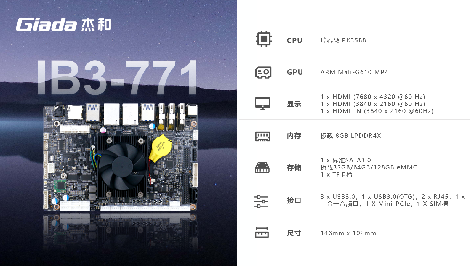 凯发官网ARM主板IB3-771采用瑞芯微RK3588处理器,满足各种人工智能场域对嵌入式主板包括但不限于高算力、低功耗、高扩展性、高可靠性、高安全性等要求,支持在宽温、复杂电磁等恶劣环境下稳定运行,可广泛应用于机器人、边缘计算、智能NVR、智能汽车、智慧大屏、AR/VR、ARM PC、智能自助终端等AIoT行业类应用市场。