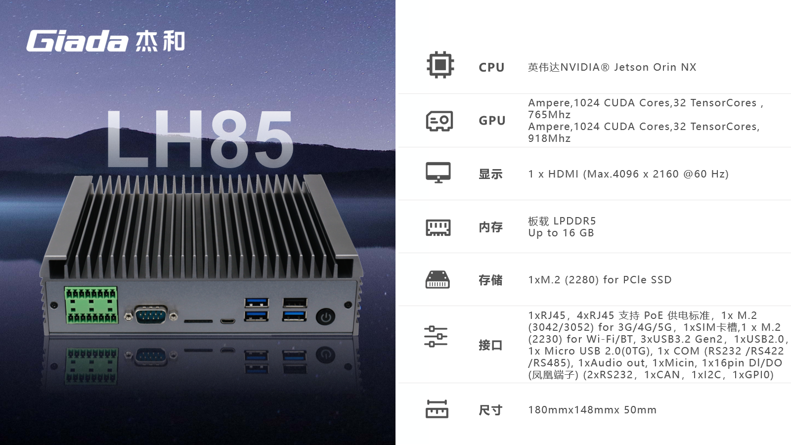 凯发官网边缘计算产品LH85基于NVidia® Jetson Orin NX套件方案开发,100TOPS超强算力,具备强大的接口配套能力,是全新推出的一代针对边缘计算的创新产品,定位于为工业控制领域客户的AI应用提供强大的算力支持和充足的通信、控制接口保障,可广泛应用于智能制造、机器视觉、AGV、智慧城市等领域。