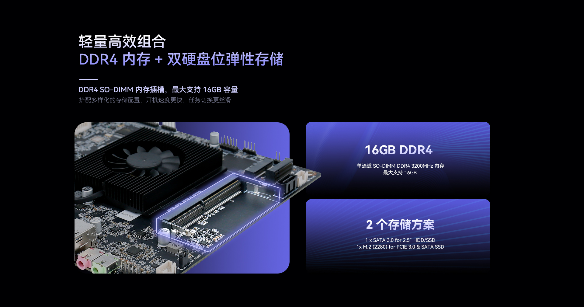 | 存储 | 类型 | 1xM.2(2280)for(pcie3.0x1&sata)SSD 1xSATA for HDD/SSD |