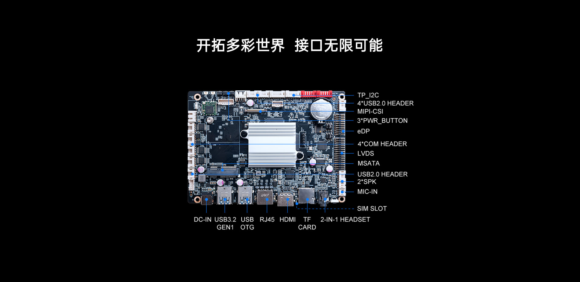 | 外部I/O | 接口 | 1 x HDMITM(Max.3840 x 2160 @60 Hz) 1 x USB3.2 Gen1 OTG, 1 x USB3.2 Gen1 1 x RJ45 1 x Full-size Mini-PCIe for 3G/4G,1 x SIM Slot,板载Wi-Fi/BT 1 x 2-IN-1 Headset (AUDIO-OUT & MIC-IN) |